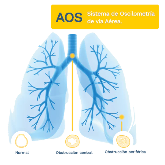 La tecnología principal del AOS se basa en la implementación compacta de la Técnica de Oscilación Forzada (TOF), una técnica no invasiva que evalúa la función pulmonar mediante la superposición de ondas de aire multifrecuente por encima de la respiración espontánea del paciente.