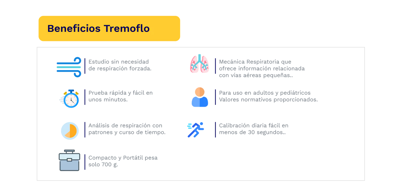 Tremoflo Sistema de Oscilometría de vía aérea (AOS), es un dispositivo médico portátil pensado para controlar la función pulmonar y facilitar la evaluación de patologías pulmonares, como el Asma o EPOC (enfermedad pulmonar obstructiva crónica), en adultos y niños.